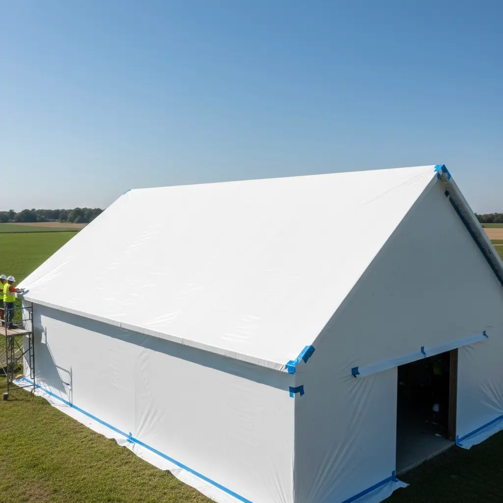 The Guidance: We provide extra-wide heat shrink sheet plastic designed to create a weather-tight, hermetic barrier that shields structures from dust, rain, and prolonged sun exposure.